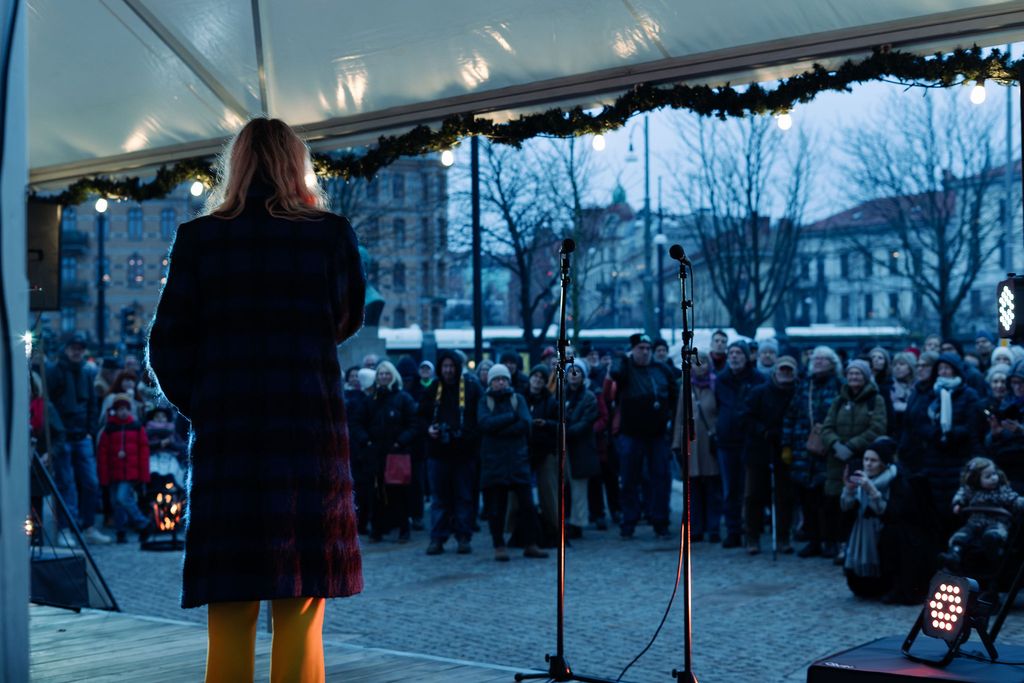 Trots det bistra vädret bjöd nyinvigningen av Olof Palmes plats på en publikfest under lördagen. En av höjdpunkterna på agendan var förstås avtäckningen av festivalaffischen som har målats i olja av konstnären Lovisa Sköld. I ett samtal med festivalens konstnärliga ledare Pia Lundberg berättade Lovisa Sköld om konstverket och hur motivet – en kvinna i en glansig lackkappa mot bakgrund av en upplyst Göteborgssilhuett – anspelar på årets fokustema, Focus: Truth.